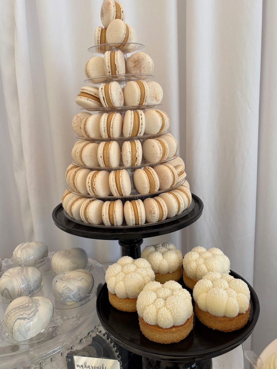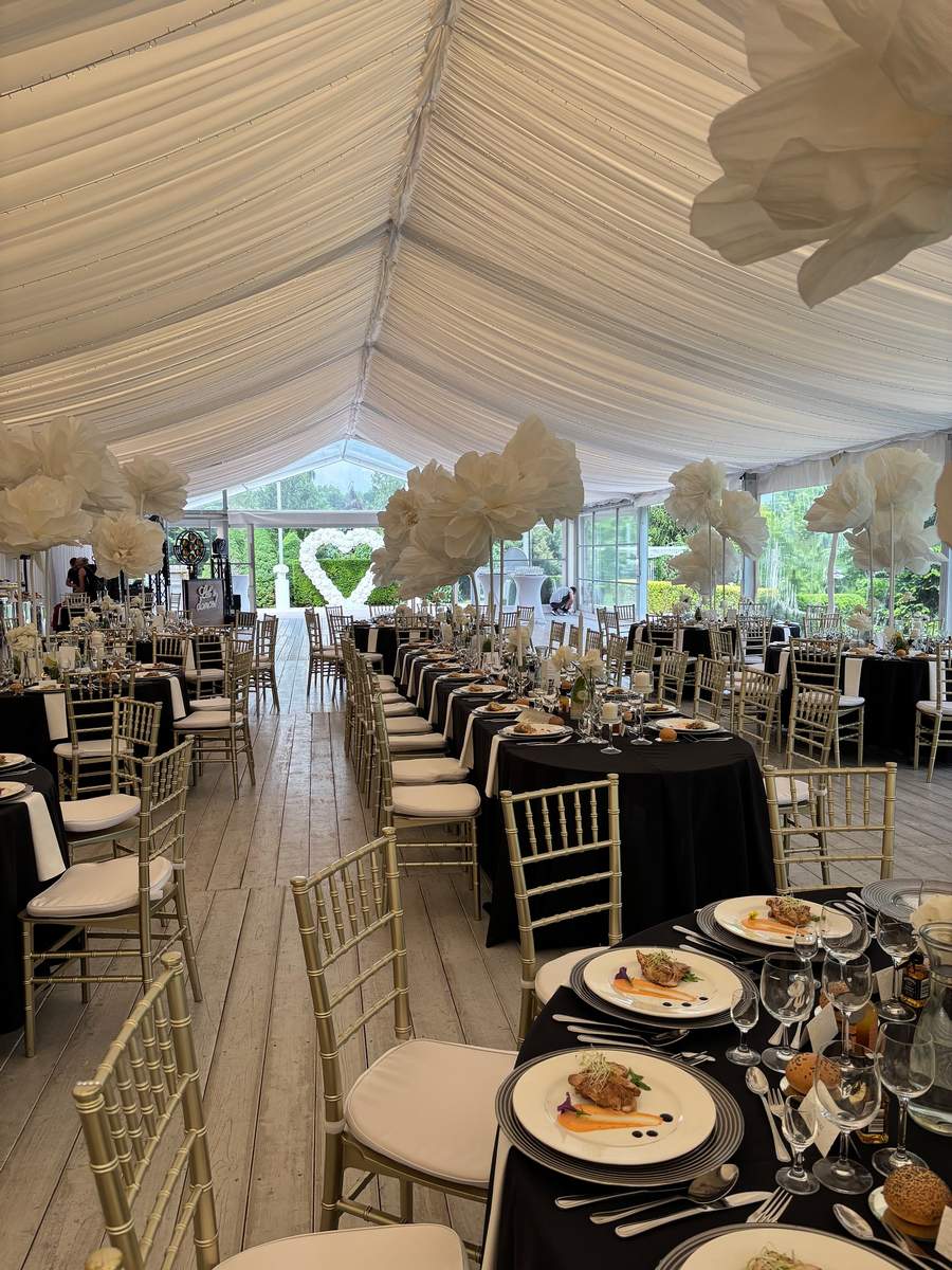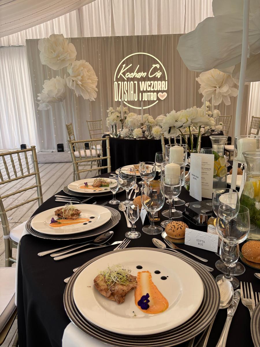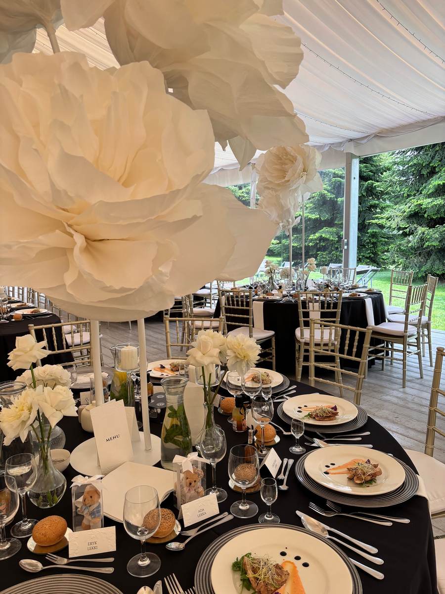 Czarno-biała kolorystyka na weselu? Czemu nie! W Brzoskwinia Ogród każdy pomysł Młodej Pary wygląda zjawiskowo, a ten szczególnie ekstrawagancko! Czarne obrusy, białe ekstrawaganckie kwiaty z bibuły w formacie maxi jako dekoracje, jednokolorowy słodki stół! Nie można odmówić tej aranżacji nietuzinkowości! Nasz catering weselny i perfekcyjna, jak zawsze obsługa, dopełniły całości.