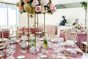 Wysokie kompozycje kwiatowe: To strzał w dziesiątkę! Umieszczone na wysokich stojakach bukiety nie zasłaniają twarzy gości, pozwalając na swobodną rozmowę, a jednocześnie wypełniają przestrzeń ponad stołami.