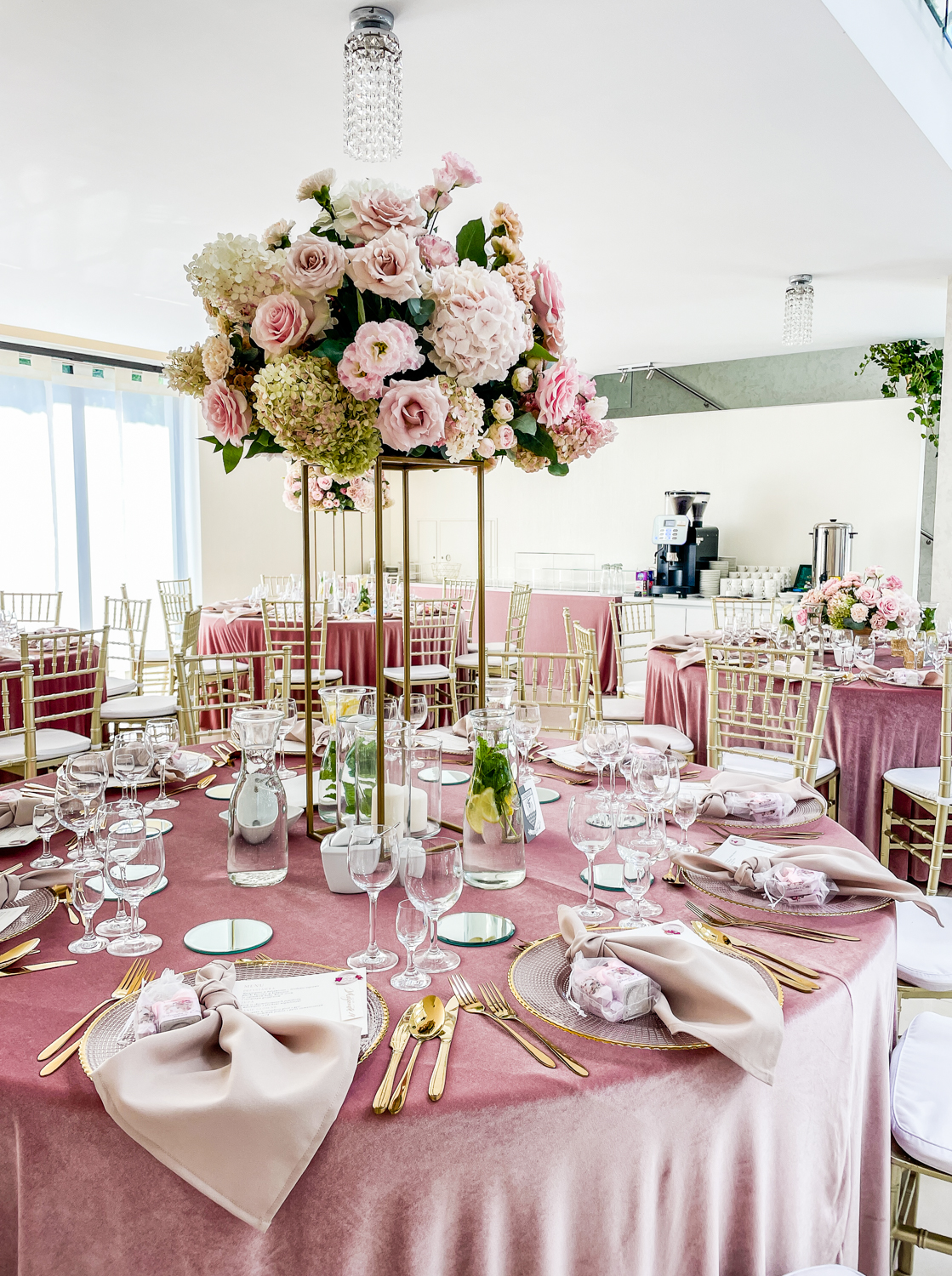 Krzesła Chiavari: Klasyczne, złote krzesła lub przezroczyste, którymi dysponujemy w Trianie, idealnie komponują się z okrągłym kształtem blatów, nadając całości lekkości.