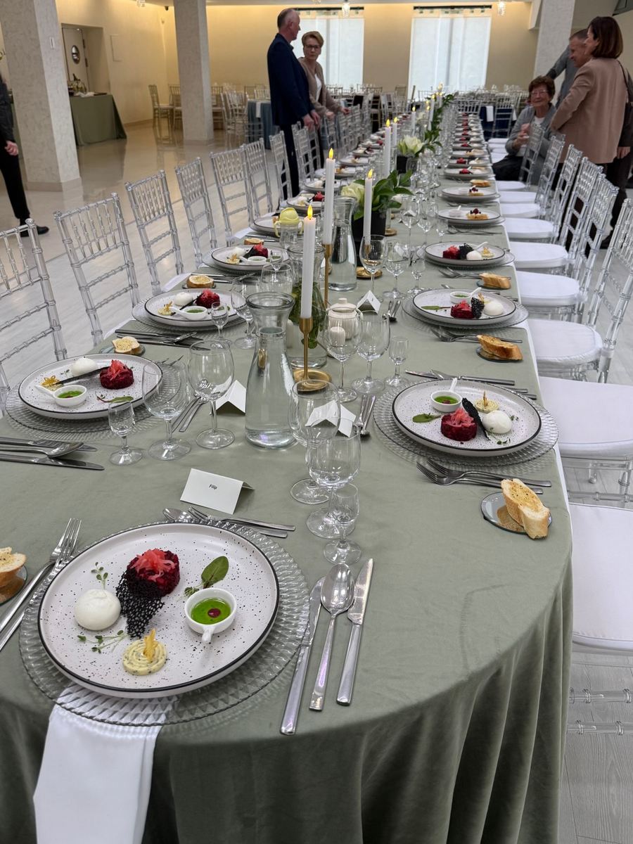 Wybór tego koloru nie był przypadkowy – oliwkowozielone obrusy to nasza odpowiedź na poszukiwanie spokoju i autentyczności w oprawie eventów. Obrusy w tym odcieniu tworzą niezwykle szlachetne tło, które wydobywa blask złotych detali i czystość porcelany, jednocześnie nadając przestrzeni przytulny, niemal intymny charakter. Co sprawiło, że ta aranżacja zachwyciła gości? Miękkość oliwkowego obrusa zestawiliśmy z nowoczesnymi, transparentnymi krzesłami Chiavari, co pozwoliło uniknąć ciężkości i dodało sali lekkości. Oliwka w blasku świec zyskuje unikalną głębię, wprowadzając nastrój sprzyjający długim rozmowom i celebrowaniu wspólnych chwil.