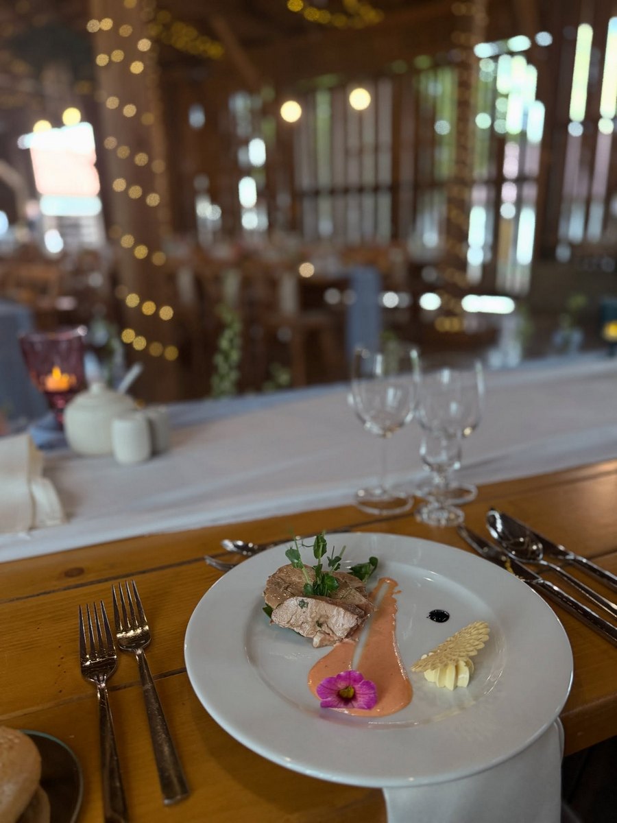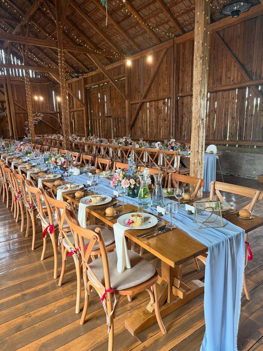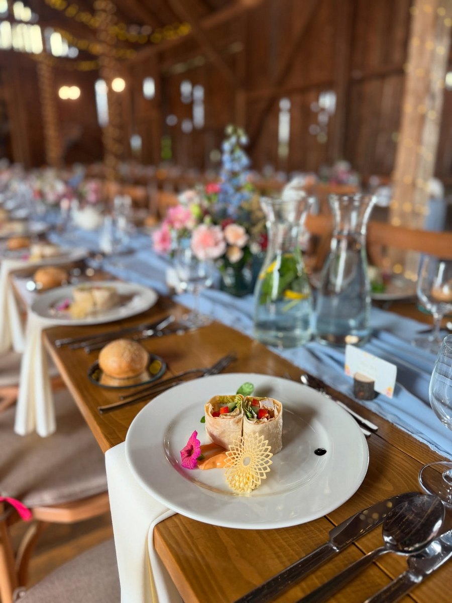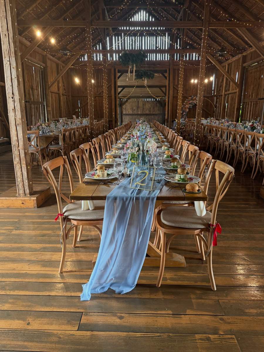 Na Ranczu Wiktoryjka mieliśmy przyjemność zorganizować catering weselny, który idealnie wpisał się w sielski klimat tego miejsca. Drewniane wnętrza stodoły udekorowane girlandami światełek, proste drewniane stoły i krzesła przyozdobione długimi, pastelowo błękitnymi bieżnikami oraz subtelnymi dekoracjami z kwiatów to przepis na bajkową scenerię dla uroczystego przyjęcia weselnego.
