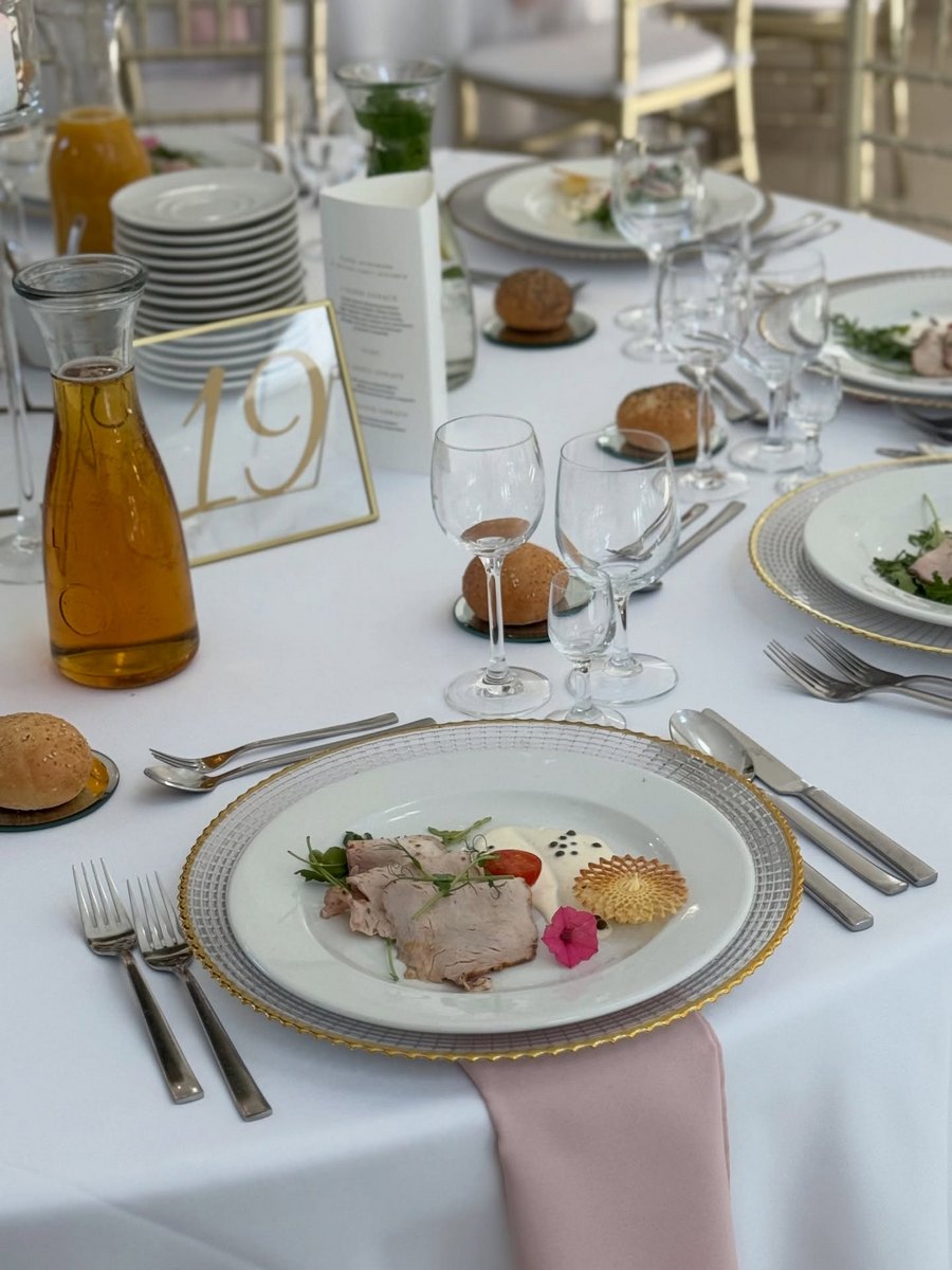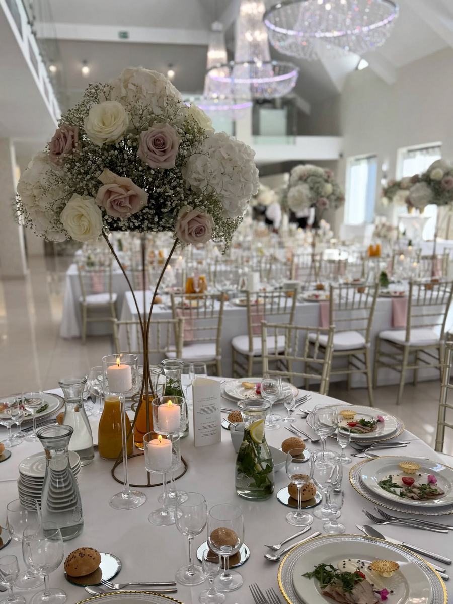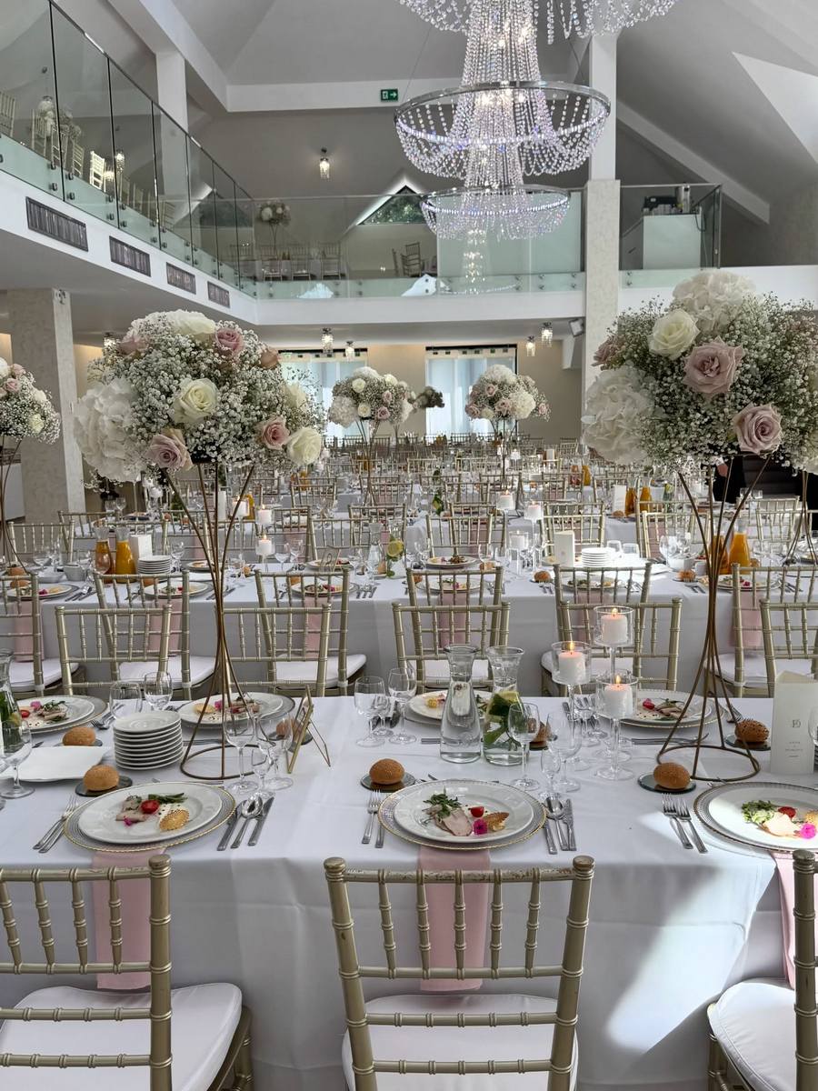 - Wystrój: Królowała klasyczna elegancja – złoto, szkło i delikatny róż serwetek.